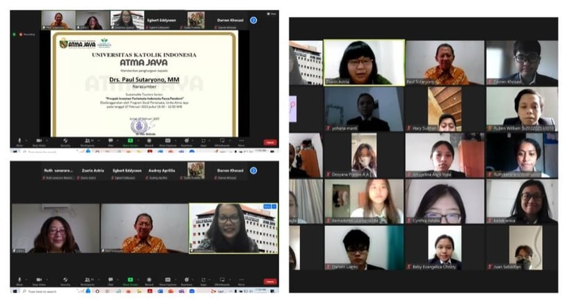 WEBINAR PROSPEK INVESTASI PARIWISATA INDONESIA PASCA PANDEMI Untuk kedua kalinya Pusat Pariwisata Berkelanjutan Indonesia bekerja sama dengan program studi Pariwisata Unika Atma Jaya menyelenggarakan webinar dalam program Sustainable Tourism Series. Adapun topik yang dibahas dalam webinar kali ini adalah tentang masalah investasi pariwisata di masa setelah pandemi. Seperti telah diketahui bersama, sektor pariwisata merupakan sektor yang paling terdampak oleh adanya pandemi. Semua perjalanan wisata di seluruh dunia dihentikan untuk mencegah meluasnya penyebaran virus Covid-19. Adapun yang menjadi pembicara dalam kesempatan kali ini adalah Pengamat Perbankan di Indonesia yaitu Drs. Paul Sutaryono, M.M. Beliau merupakan pengamat dan penulis aktikel tentang Penbankan Indonesia yang cukup aktif. Beliau juga bertindak sebagai staf ahli dari Pusat Pariwisata Berkelanjutan Indonesia (PPBI). Bertindak sebagai moderator dalam kesempatan ini adalah dosen Program studi Administrasi Bisnis Unika Atma Jaya ibu Rosdiana Sijabat, Ph.D.
